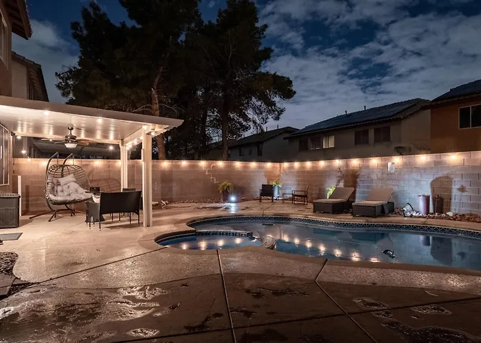 5Br 3Ba Family Friendly Entire Home W Pool, Spa, Games, Tvs, And More Las Vegas bevindt zich in de wijk Henderson van Las Vegas, op ongeveer 10-minuten rijafstand van Barley's Casino & Brewing Co, en beschikt over een privézwembad waar gasten kunnen ontspannen. De villa biedt gasten een ontspannende ervaring met een bubbelbad.